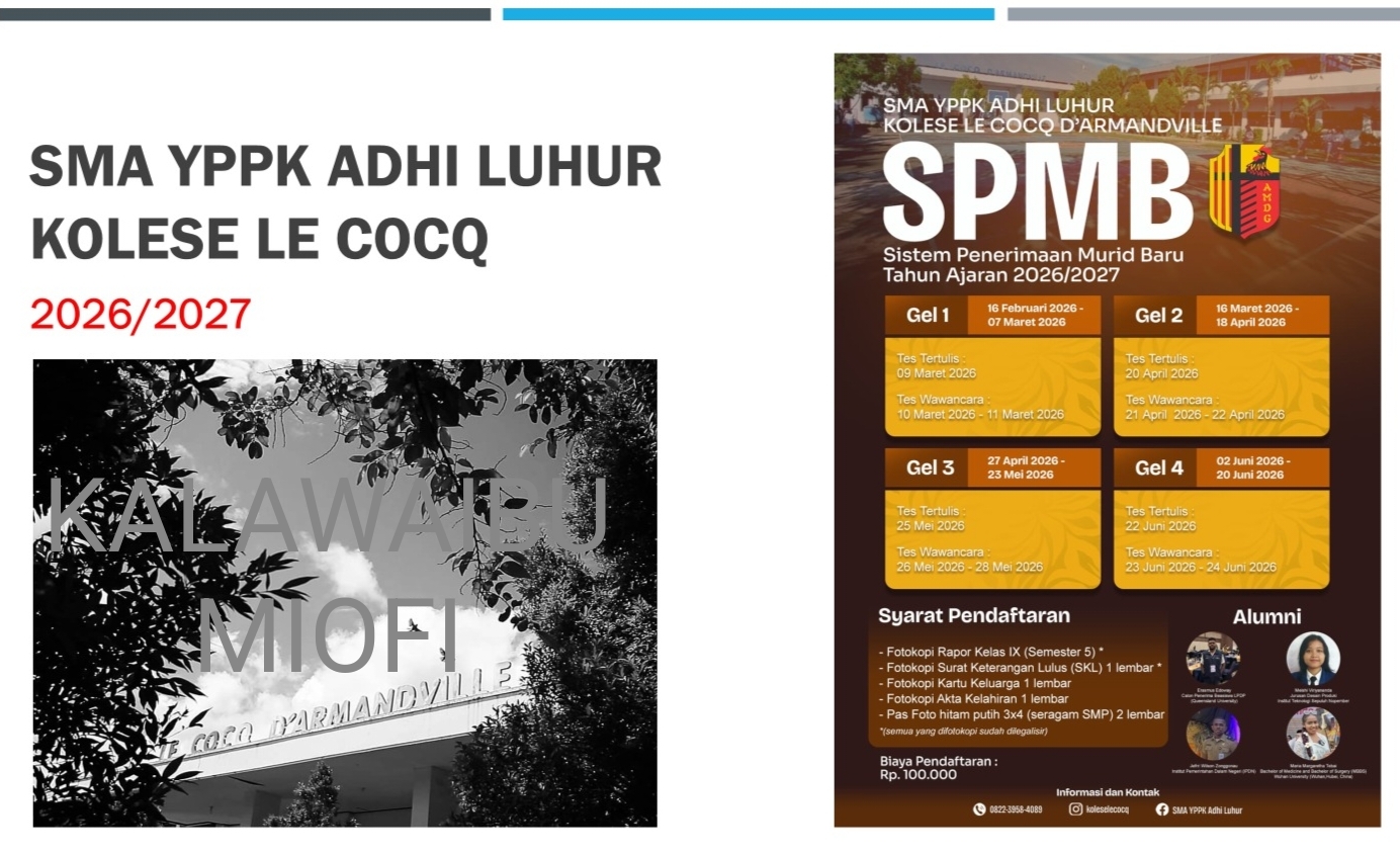 Nabire, Kalawaibumiofi.com | SMA YPPK Adhi Luhur Kolese Le Cocq resmi membuka penerimaan murid baru (SPMB) untuk Tahun Ajaran 2026/2027. Sekolah yang dikenal dengan nama Kolese Le Cocq d’Armandville ini menawarkan kesempatan bagi lulusan SMP atau sederajat untuk melanjutkan pendidikan di lembaga yang berfokus pada pengembangan akademik dan karakter.