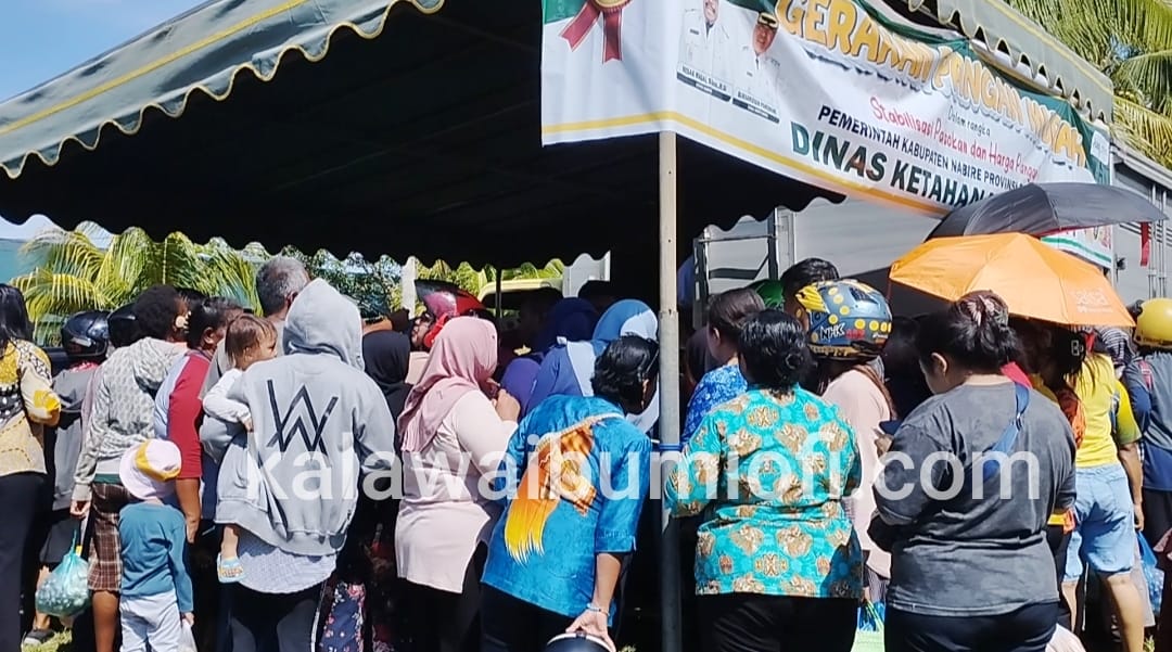 Nabire, Kalawaibumiofi.com | Badan Urusan Logistik atau Bulog Nabire, Papua Tengah terlibat dalam gerakan pangan murah yang diselenggarakan Dinas Ketahanan Pangan Kabupaten Nabire, di Taman Paraduta Kodim 1705/Nabire, Kamis (12/03/2026).