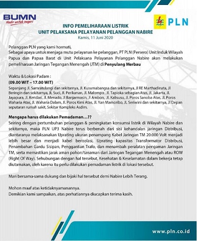 Nabire, BNN – Berikut kami Informasikan jadwal pemadaman untuk Hari Kamis, 11 Juni 2020, pemadaman start pukul 09.00-17.00 WIT.