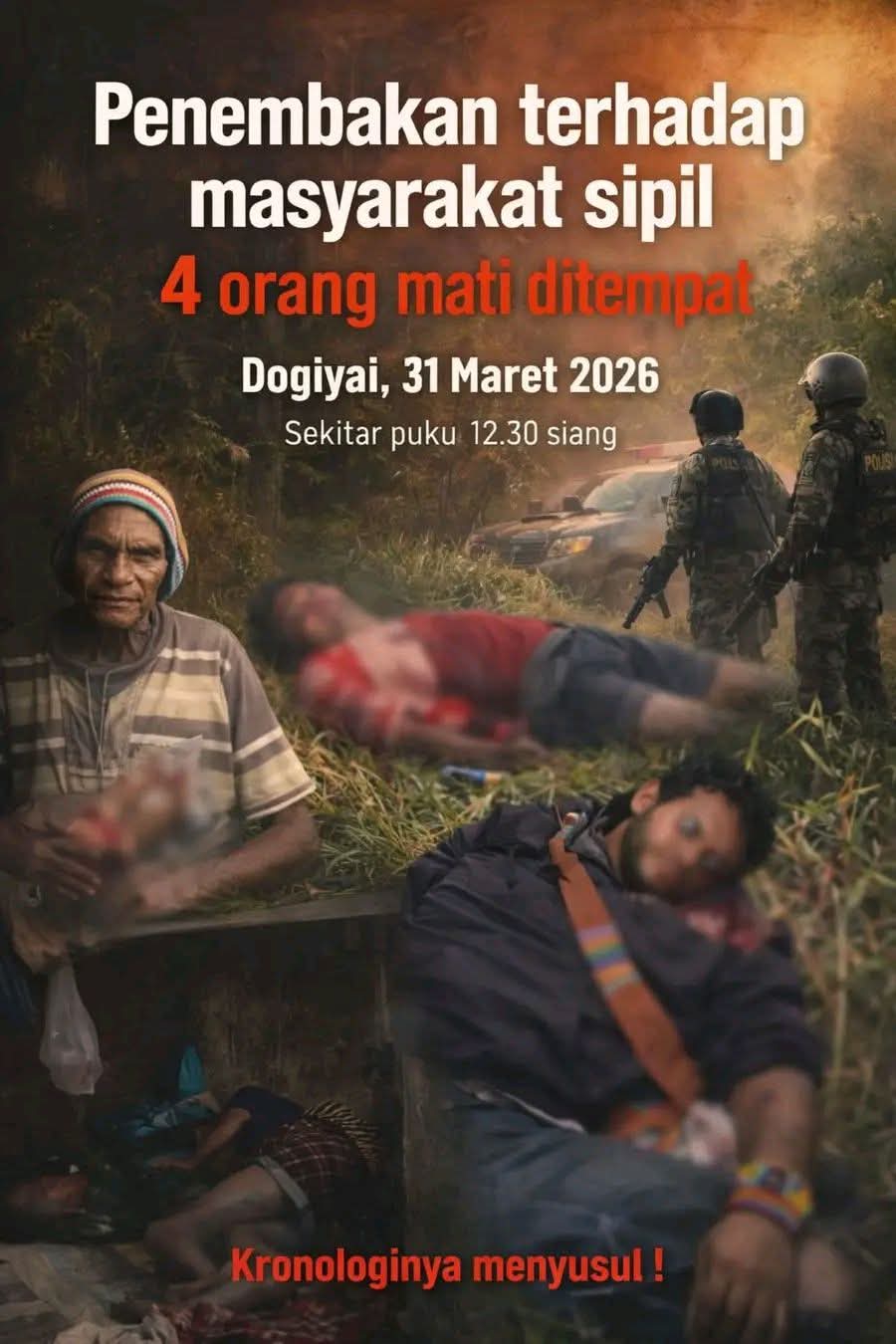Berdasarkan informasi yang dihimpun, satu anggota Polres Dogiyai berinisial JE (24) tewas dibacok oleh Orang Tak Dikenal (OTK). Pasca kejadian tersebut, situasi memanas dan dilaporkan terjadi bentrokan lanjutan yang mengakibatkan sejumlah warga sipil menjadi korban.