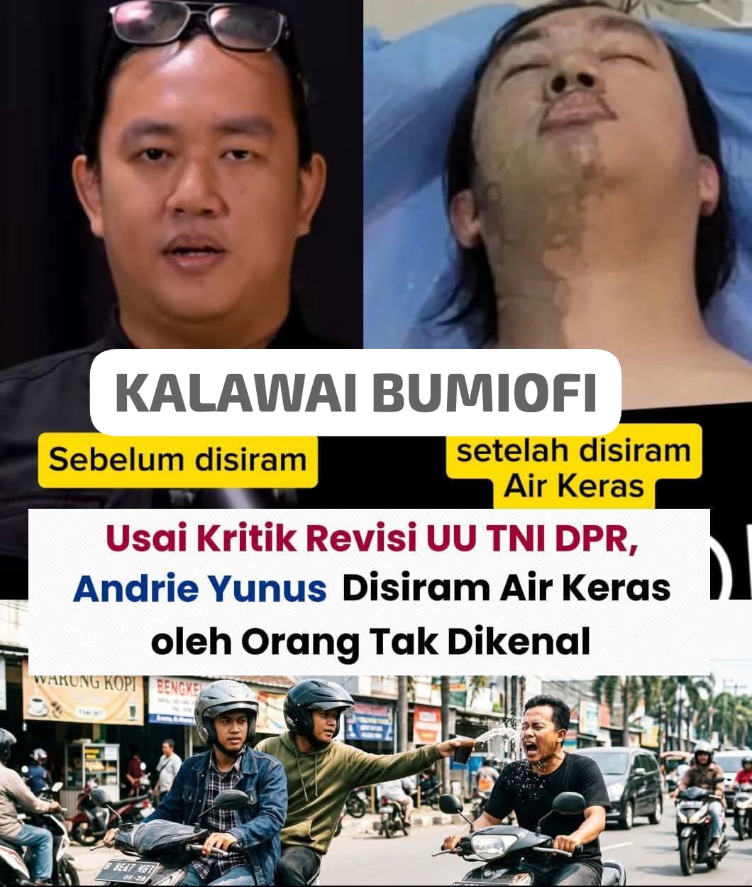 Andrie Yunus mengalami serangan yang menyebabkan luka bakar serius pada 24 persen tubuhnya (wajah, mata, dada, dan kedua tangan). Dua orang pelaku mendekatinya dengan sepeda motor dan menyiramkan cairan kimia berbahaya sebelum melarikan diri. Peristiwa ini terjadi setelah ia menyelesaikan aktivitas advokasi publik, termasuk perekaman podcast bertema remiliterisasi dan judicial review UU TNI di kantor Yayasan Lembaga Bantuan Hukum Indonesia (YLBHI).