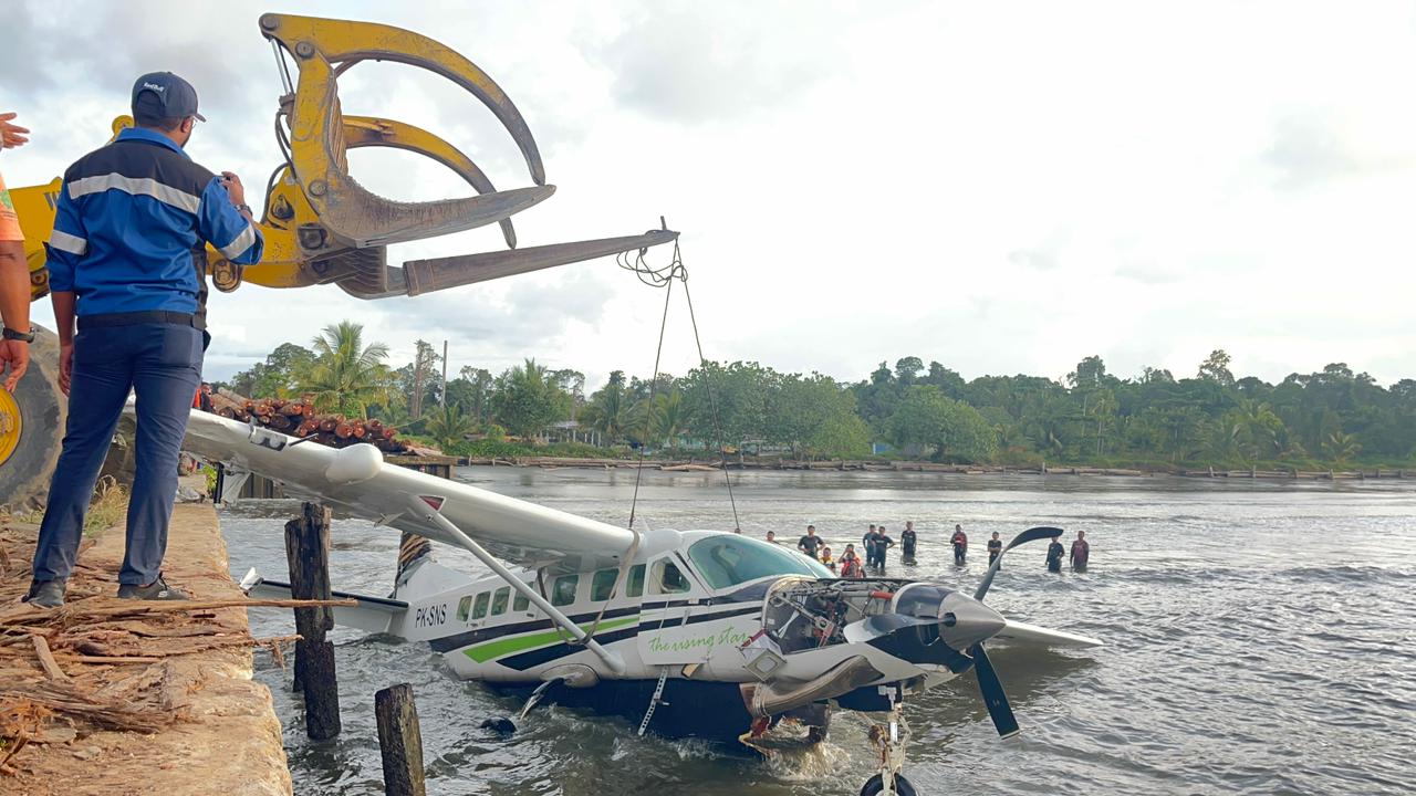Saat ini, pesawat Smart Air tersebut telah berhasil ditarik ke darat dan ditempatkan di lokasi perusahaan PT. JDIP untuk proses pemeriksaan lebih lanjut.